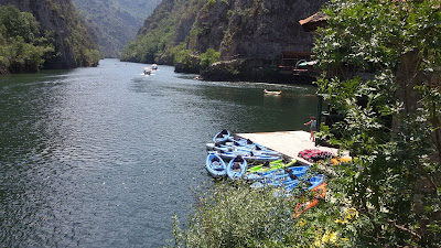 Bizimkisi Kanyon gezisi değil, Kanyon tabanı suyla dolu olduğu için yapay göl kıyısındaki patikada yürümek.. Yalnız yürümek yanlış; uçurum yüksekliğinde patikadan göle düşmeniz sizi kanyon derinliğine çekebilir.. Kanyondaki son kanoyu izliyorum, onlar dönerse döneceğim. Ve öyle yaptım, saat 12:30’da Matka gezimiz bitti. Dahası Balkanlar..